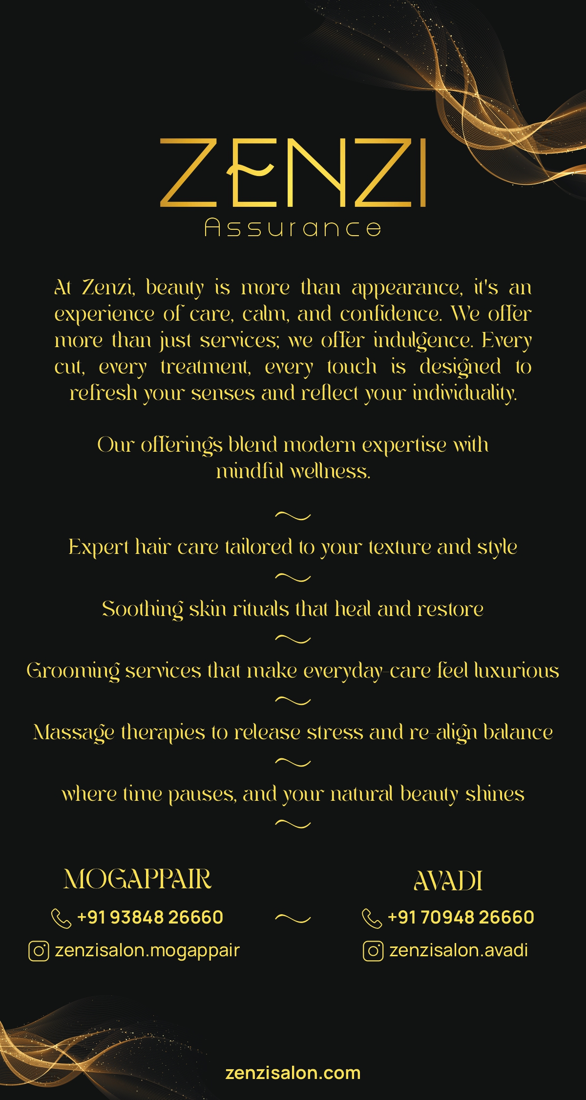 Zenzi Avadi is our second chapter in our growing story — bringing our signature dedication to excellence to a lively, growing area of Chennai. This venue offers as the same Zenzi values of quality, consistency, and style with an emphasis on customer comfort and personalized attention. It's not just a salon, it's a destination for style for the Gen Z & Gen Alpha